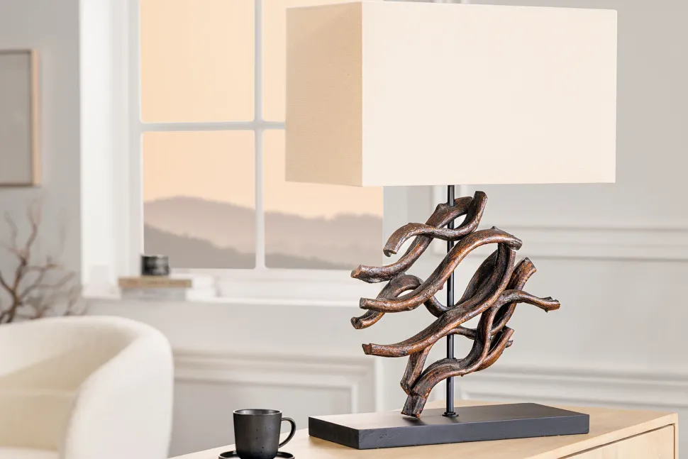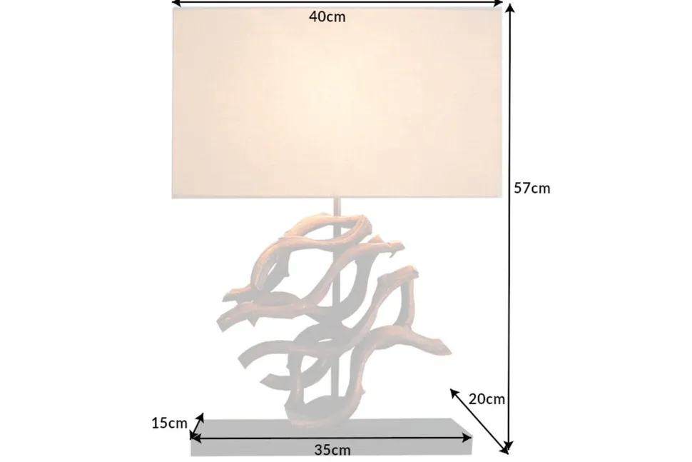 Moderne Tischleuchte aus Teakholz und Stoff in Natur und Beige