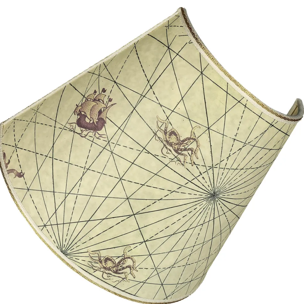 Für eine angenehme Ambientebeleuchtung sorgt der aufgesetzte Schirm aus Pergament Papier, der den Ausschnitt einer antiken Seekarte darstellt.
