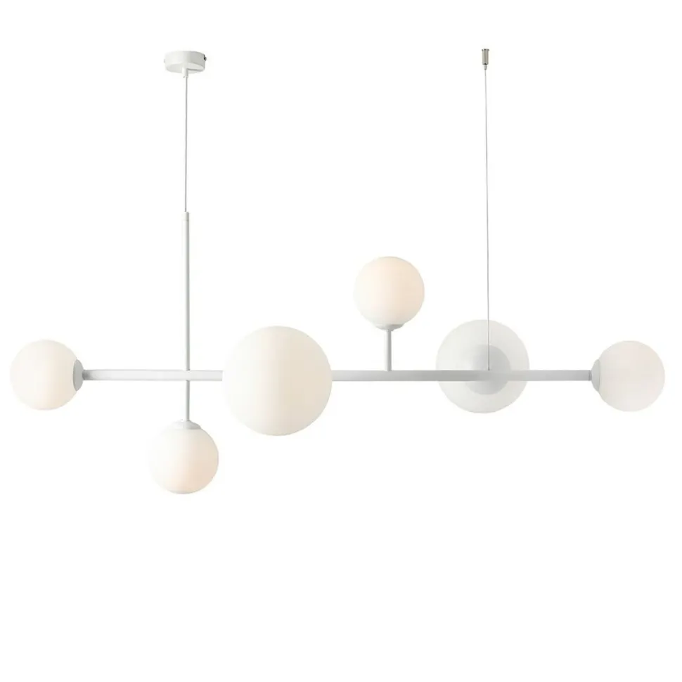Die satinierten Glasschirme der Pendelleuchte im Kugel Design streuen das Licht blendarm für eine wohnliche Atmosphäre über Deinem Esstisch in Wohnzimmer und Esszimmer